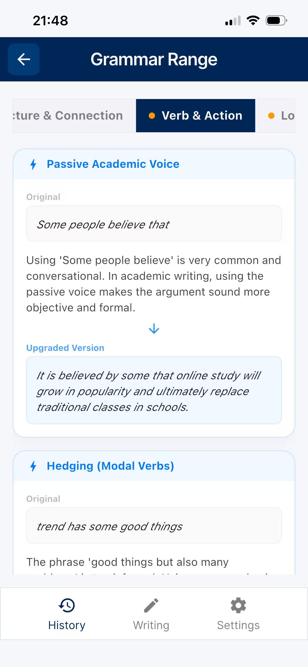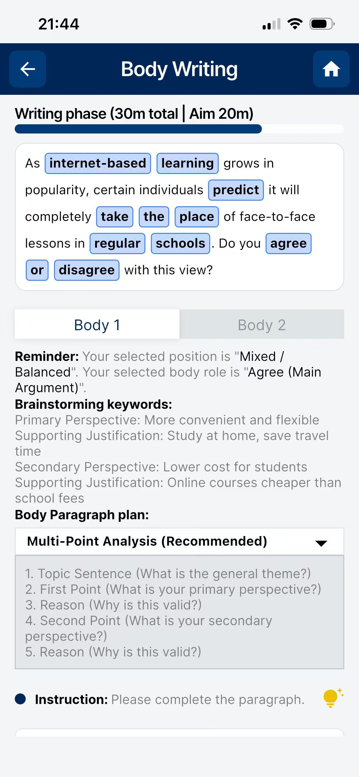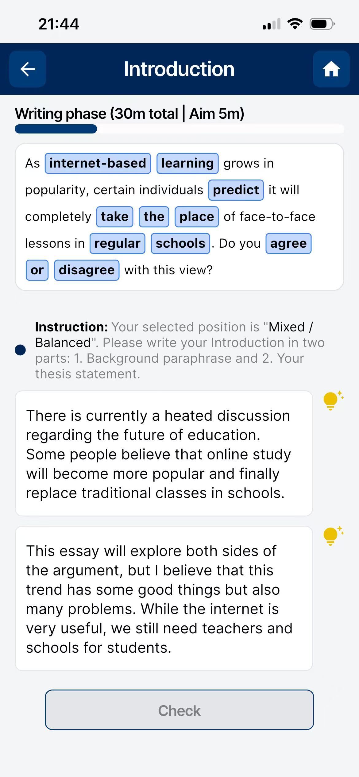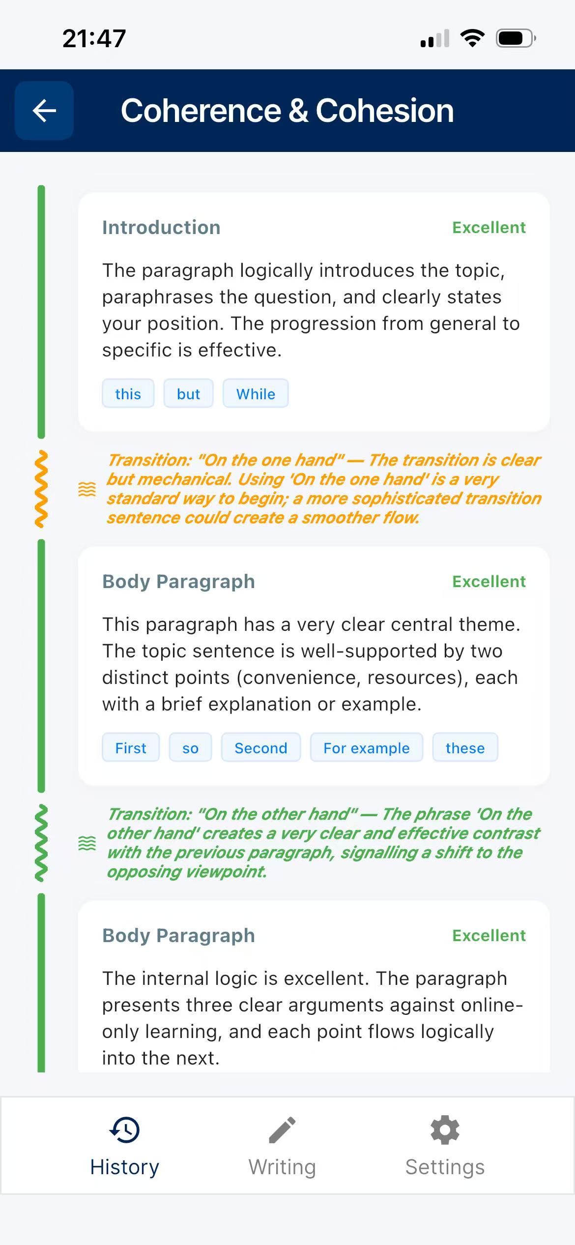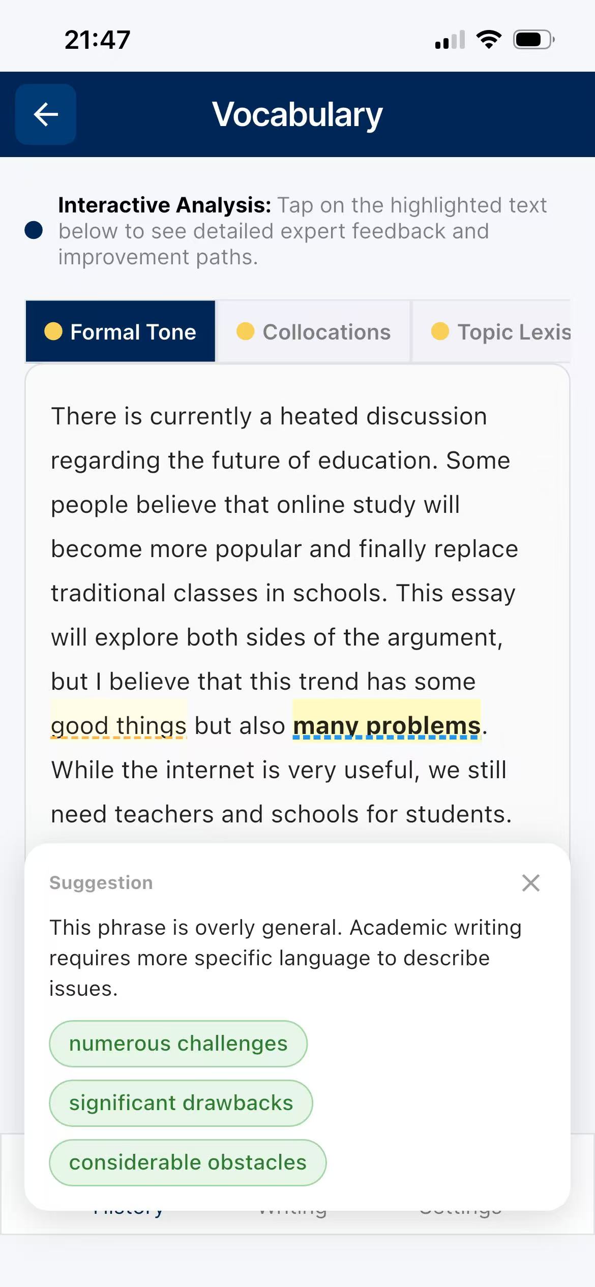 Stuck on ideas? Let our AI interactively guide you through generating viewpoints, structuring paragraphs, and selecting high-level vocabulary before you even write a single sentence.