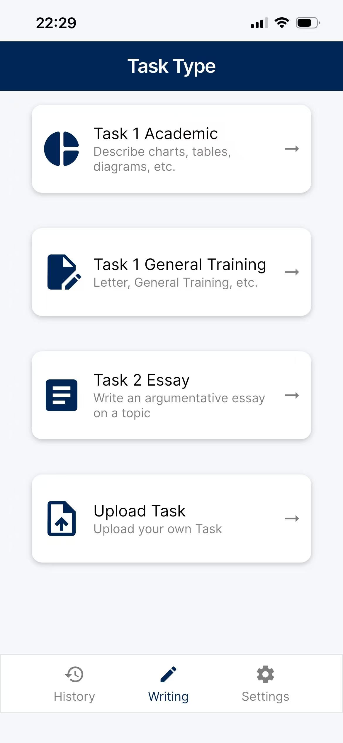 Whether you are taking the Academic or General Training test, Ariven's AI engine is specifically trained to grade and tutor all IELTS Writing formats accurately.